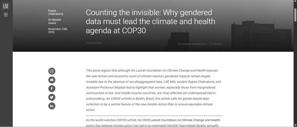 This piece argues that although the Lancet Countdown on Climate Change and Health exposes the vast human and economic costs of climate inaction, gendered impacts remain largely invisible due to the absence of sex-disaggregated data. LSE MSc student Rupsa Chakraborty and Assistant Professor Miqdad Asaria highlight that women, especially those from marginalised communities in low- and middle-income countries, are most affected yet underrepresented in policymaking. As COP30 unfolds in Belém, Brazil...